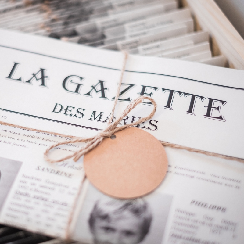 Le magazine "A la folie", trimestriel des mariages atypiques et romantiques, consacre un article aux Gazettes des Mariés de Plume & Coquelicot dans son dossier "Tendances de la saison - Nos idées pour vos cadeaux invités".